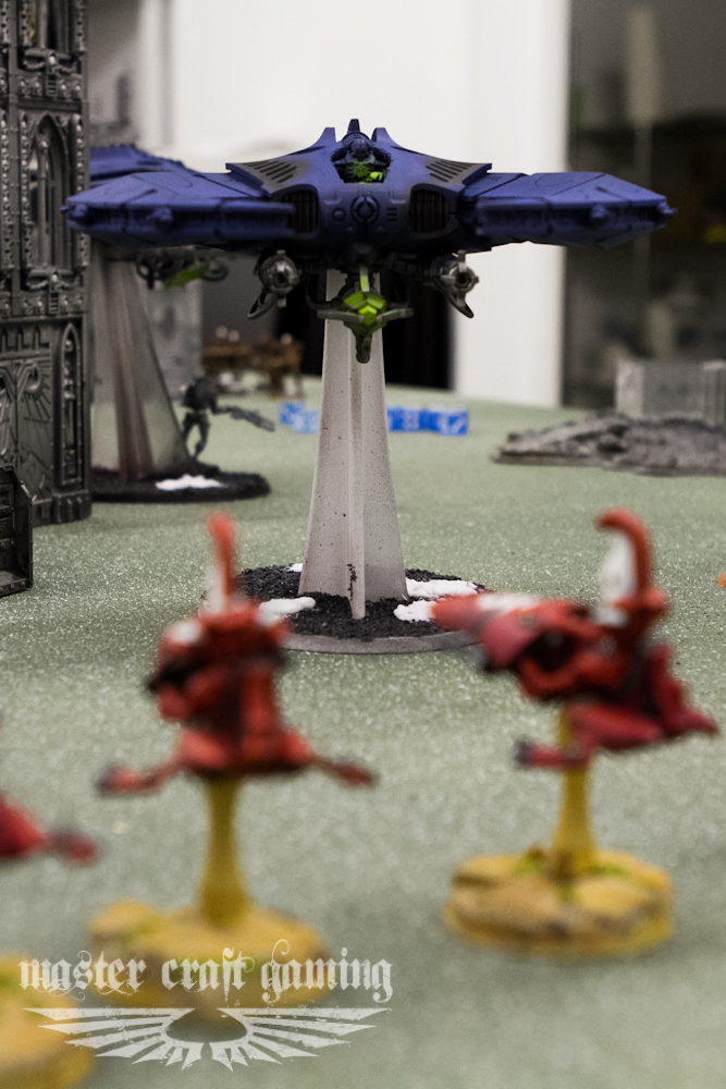 For my turn five, I jumped the council in front of the wraiths in order to fill their space for a charge towards that objective. I dropped the swooping hawks back onto his home objective that was now abandoned by his wraiths. In his turn five all of his scythes came back on. The two night scythes dropped of their cargo and killed what was left of the snipers on the far corner objective. He broke off his destroyer Lord and just managed to be able to jump him over the council and contest the center objective. The paladins were remarkably able to kill 4 of the council and the Wraiths managed to get the charge range they needed to assault the swooping hawks, wiping them out.