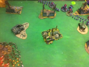 The third mission was P: Objectives, S: KP, T: Quarters with a vanguard deployment. He won the roll for first and passed it to me. I setup the Deldar in their Aegis around my back objective, and infiltrated the snipers onto the two corner objectives. He deployed Draigo and boys behind the center piece of terrain, and the wraiths defensively behind his back objective. In turn one I put some wounds on the pali’s and moved my council all the way to my left side (I knew that if I got tied up with the Pali’s that the wraiths had the movement to come in and together beat the council). He replied to this bait by moving Draigo and boy to the opposite side towards my snipers, but still in range of the wraiths.