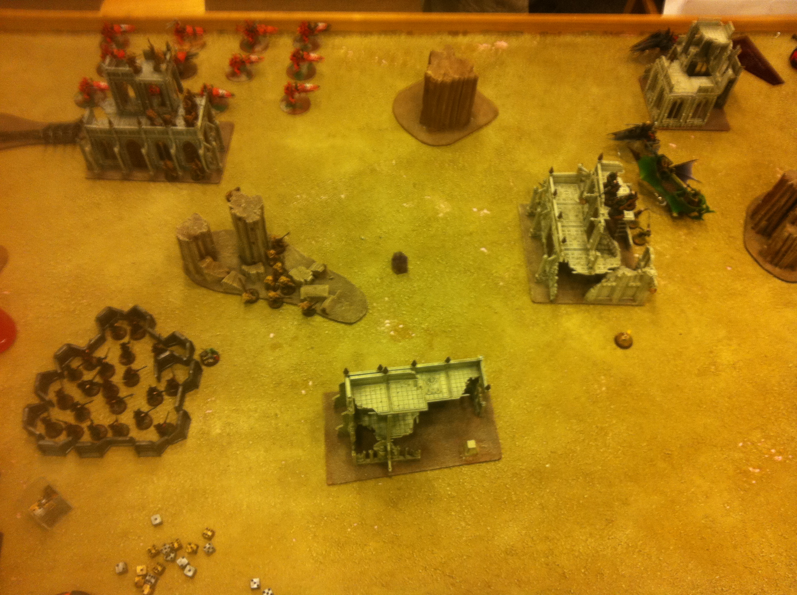 For my turn five, I preemptively covered up all of the angles for the scythes while denying and claiming all potential quarters and objectives. In his turn he realized that if the game were to end there was no chance for him, so he flew everything off the table that could fly off except the deathmarks with the destroyer lord who came down and tried to put enough wounds on the warriors to break them. My bad luck continued and unlike the previous game, the game continued when I needed it to end.
