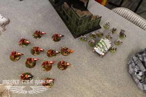 In turn two, I jumped the council up and multi-assaulted the big squad, the middle squad and the spyder. (This was my mistake at NOVA, luckily it wasn’t too important). In the combat I killed a bunch of stuff and the middle and far squads broke, but the spyder had one wound left on him and kept me tied up so that I couldn’t cut the others down. On his side of the turn, both squads regrouped and the command barge charged the council. Everything else moved up and one of the scythes came in and did some ineffectual shooting. In combat I did some damage to the barge and killed the lord and the spyder.