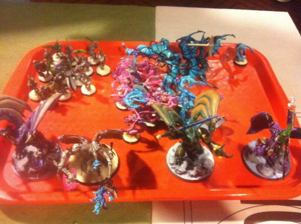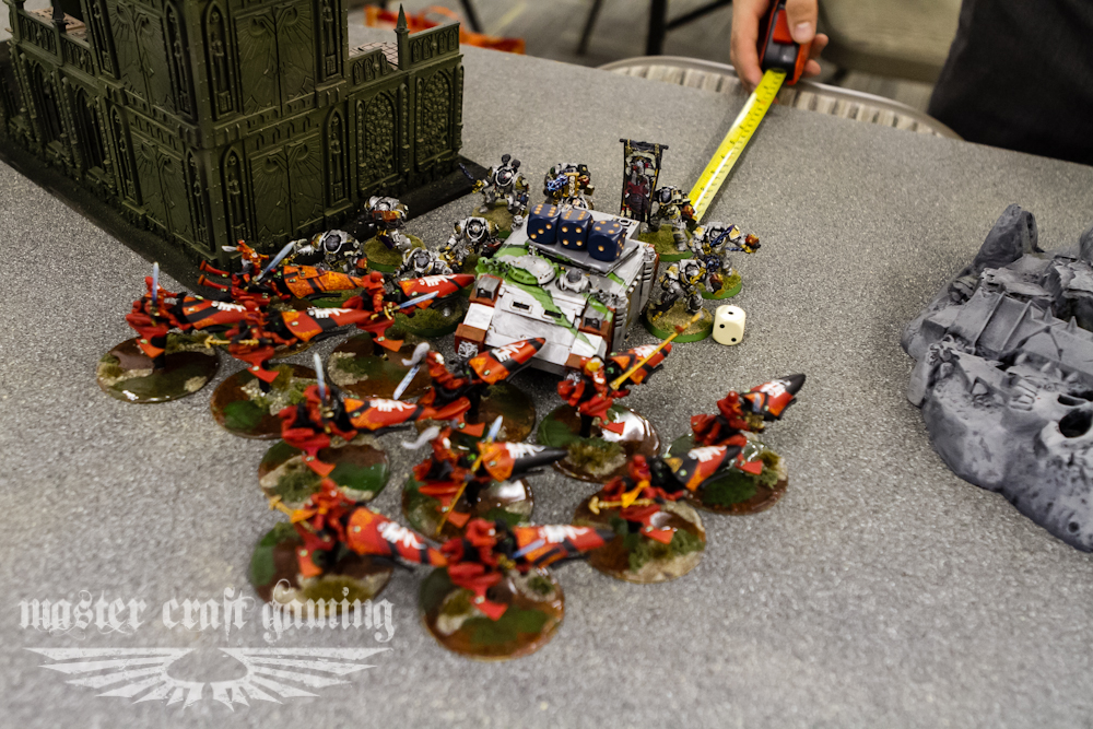 In my turn six I was in a pretty bad spot, nothing of his was on the table, but it was all coming from a place that I couldn’t stop. I moved out my guys into places that were the best I could manage to try and win by quarters. I dropped his destroyer lord and some of the deathmarks but they held and I failed the charge on them with the swooping hawks even with the fleet roll. In his turn six I was pretty exposed. He dropped the hawks, the remaining snipers on his objective and was able to get the deathmarks in to contest the center objective. Now when I needed the game to continue it didn’t. It ended up being P: 2/2, S: 2/1, T: 3/3. Dave ended up winning on the secondary.