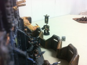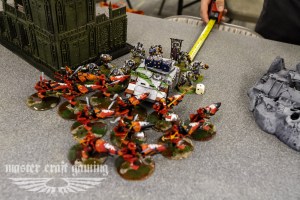 In my turn four, the council moved up and declared against the blob, but got shots on the command squad and tac squad as well. With the fire power I dropped the command and most of the blob as well as a few marines. The rest of the army shot at the tacs sitting on my left objective. Then I charged the rest of the blog with the Librarian and the tac squad. I killed all but a few and he took some down as well. In his turn four the platoon command moved out of the way, and in combat his librarian went down, but took down one of my farseers, and all but one of the tactical marines was left.
