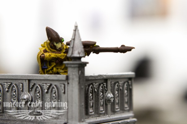 The third mission was P: Objectives, S: KP, T: Quarters with a vanguard deployment. He won the roll for first and passed it to me. I setup the Deldar in their Aegis around my back objective, and infiltrated the snipers onto the two corner objectives. He deployed Draigo and boys behind the center piece of terrain, and the wraiths defensively behind his back objective. In turn one I put some wounds on the pali’s and moved my council all the way to my left side (I knew that if I got tied up with the Pali’s that the wraiths had the movement to come in and together beat the council). He replied to this bait by moving Draigo and boy to the opposite side towards my snipers, but still in range of the wraiths.