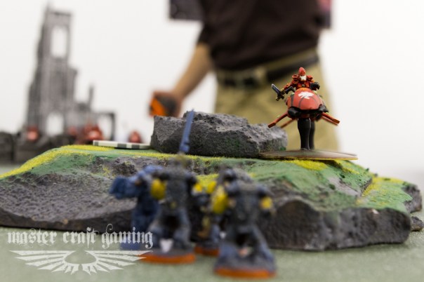 Once in the last round of a tournament, I was facing a horde ork army with a full sized nob biker unit. There was nothing in my army that could have faced that unit head on and my opponent knew it. He stretched the squad out across the board so that no matter where I went in my turn he would be close enough to engage me. I was stuck in a hard place and had to employ the tag-team.